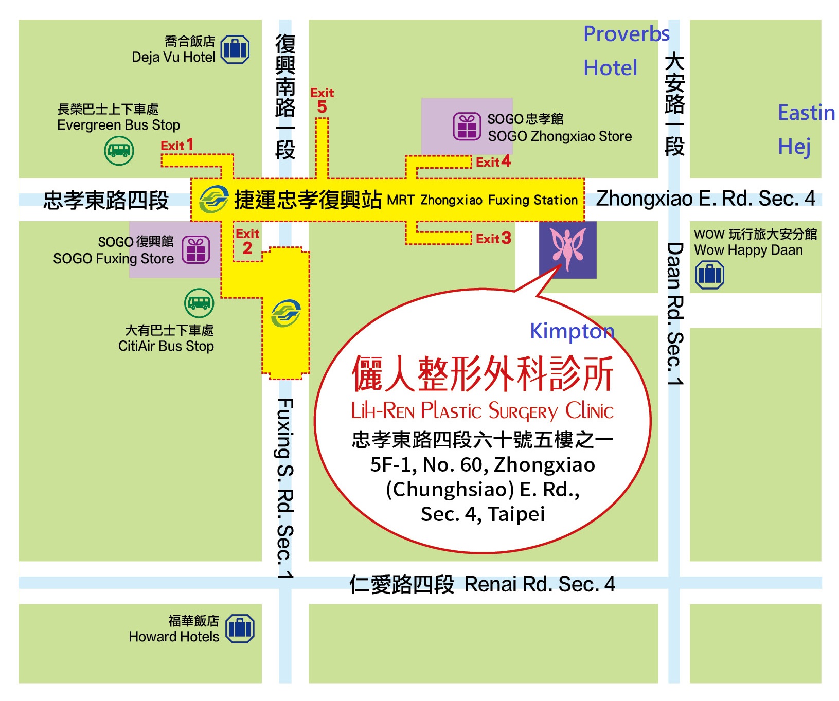 | Contact Us: Lih-Ren Plastic Surgery Clinic Address: 5F-1, No. 60 , Chung-Hsiao ( or Zhongxiao) E. Rd. Sec. 4, Daan District, Taipei, Taiwan 106 |
