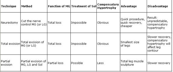 After muscle treatment and liposcution of legs, the size of above case reduced from 36.5 to 32.5cm on 5 months after surgery. Ultrasound examination on one year after surgery showed that thickness of MG has been reduced from 21 mm to 13 mm. MG function is well.