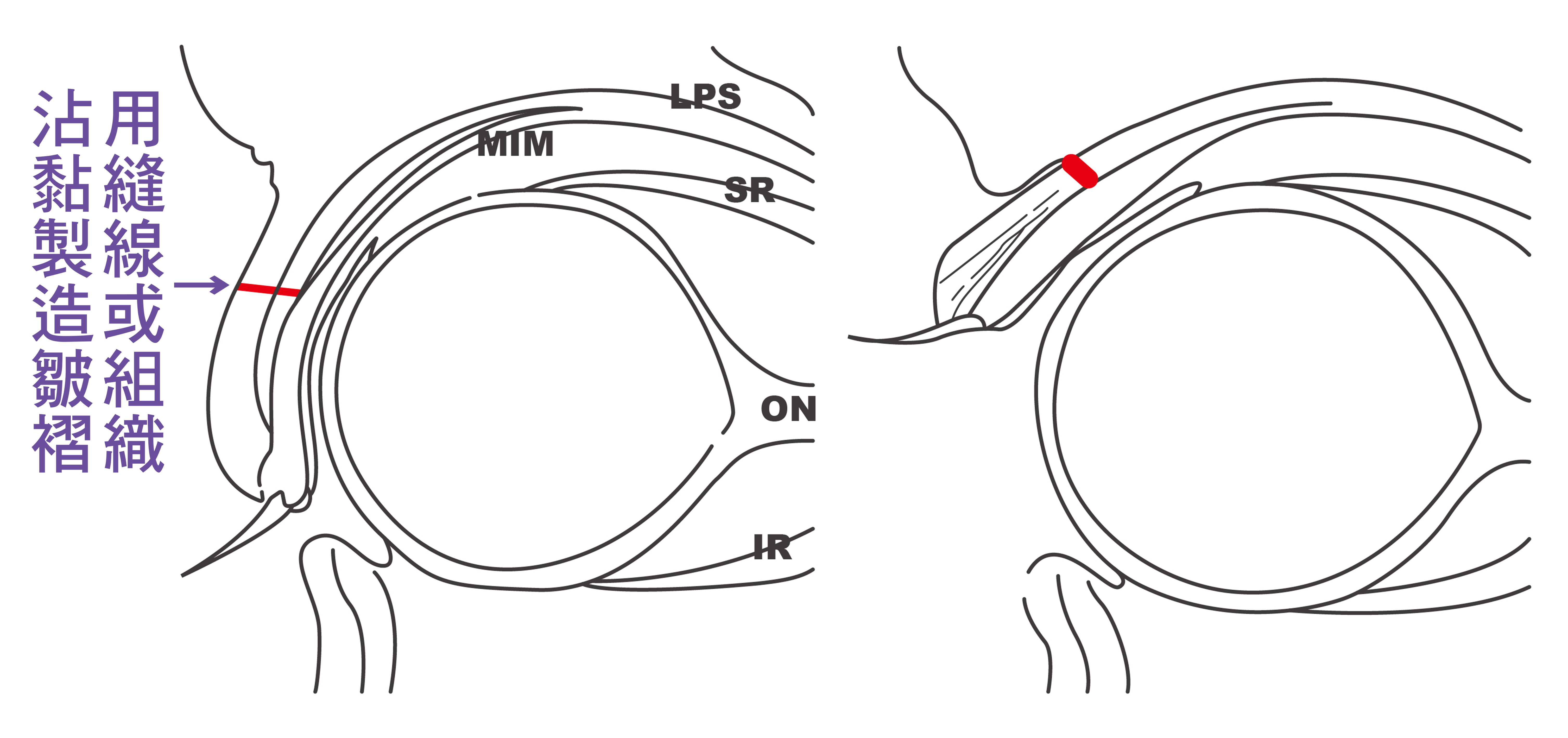 用縫線將眼皮與深層之提瞼肌或眼瞼板綁在一起(縫雙眼皮法